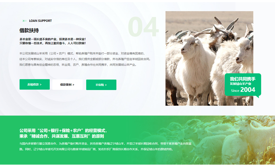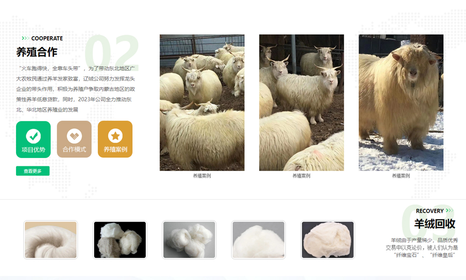 遼寧絨山羊絨毛開發(fā)有限公司采用“公司+銀行+保險(xiǎn)+農(nóng)戶”的經(jīng)營模式,秉承“精誠合作、共謀發(fā)展、互惠互利”的原則,與國內(nèi)多家銀行建立深度合作,為養(yǎng)殖戶墊付購羊資金,扶持養(yǎng)殖戶養(yǎng)殖遼寧絨山羊,并簽訂羊絨長期回收合同,帶領(lǐng)千家養(yǎng)殖戶走向致富路。同時(shí),遼寧絨山羊絨毛開發(fā)有限公司與數(shù)家羊絨制品廠商、知名針織廠商保持長期合作關(guān)系,并保證絨山羊的原絨供給。